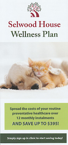 The Wellness Plan needs to be set up in clinic, either at the time of vaccination, or when your next parasite treatment is due, or simply by dropping into the clinic at a convenient time to process the application. After filling in the application form and making the first monthly payment at the time, you set up a standing order for the remaining 11 monthly payments. To help you keep up to date with included parasite prevention, Selwood sends you an automatic reminder to collect the treatments from the clinic as and when they are due. Before the end of the 12 months, you are sent a reminder asking whether you would like to have the Plan re-issued for the next year’s preventative healthcare.